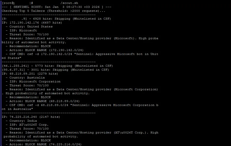 Manually checking every IP against threat databases is exhausting. To solve this, I developed Sentinel Scout, a lightweight Bash script that analyzes your traffic and uses real-time threat intelligence to give you a “Verdict” on whether to block an IP.
